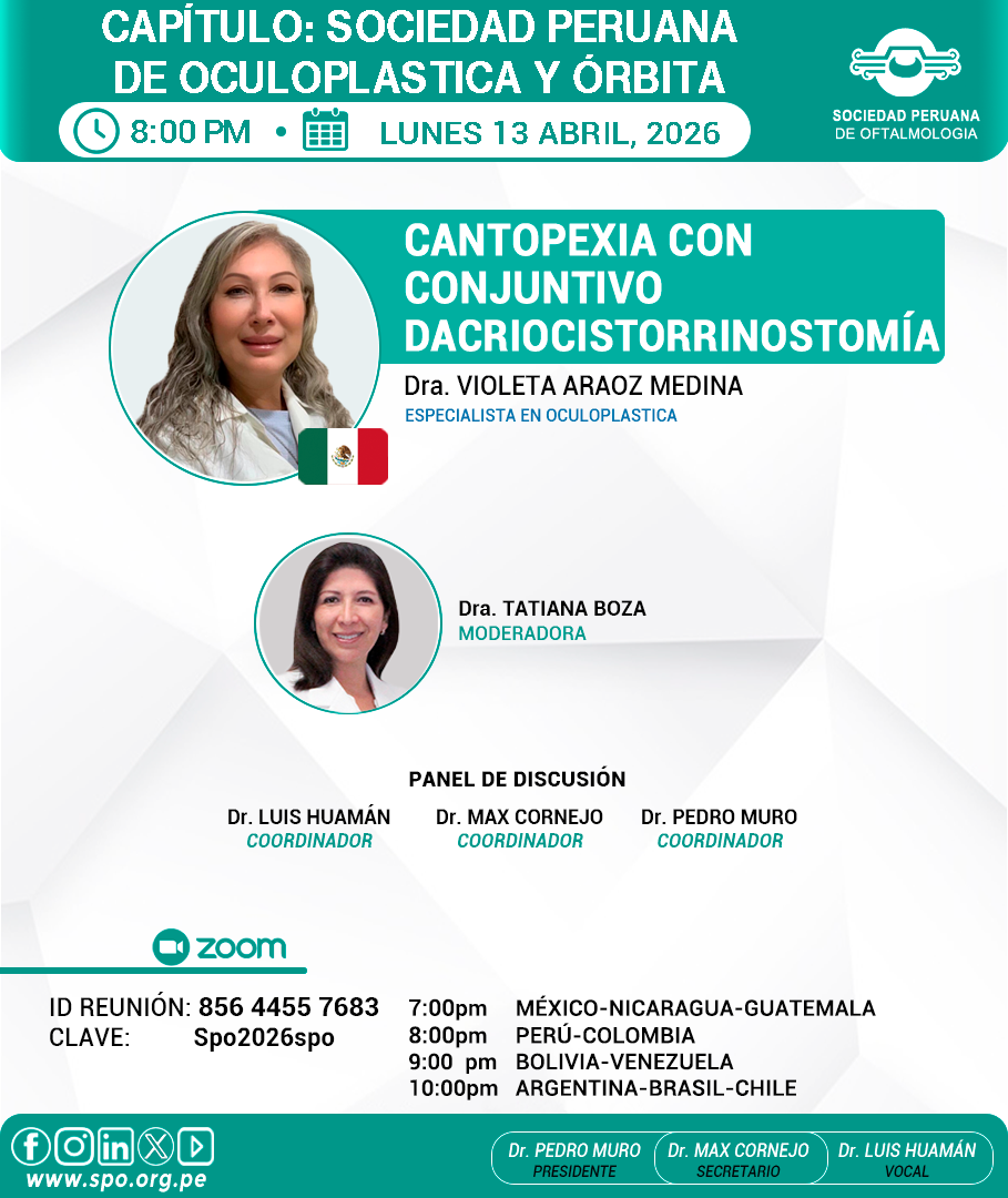 CAPÍTULO PERUANO DE OCULOPLÁSTICA Y ÓRBITA SESIÓN VIRTUAL – ABRIL2026 LUNES 13 ABRIL, 2026Dirigido a Médicos Oftalmólogos y Residentes de OftalmologíaID REUNIÓN: 856 4455 7683CLAVE: Spo2026spo INGRESAR VÍA ZOOM VER VIDEO VOLVER SESIÓN VIRTUAL – MARZO2026 LUNES 09 MARZO, 2026Dirigido a Médicos Oftalmólogos y Residentes de OftalmologíaID REUNIÓN: 856 4455 7683CLAVE: Spo2026spo INGRESAR VÍA ZOOM VER VIDEO VOLVER SESIÓN VIRTUAL – AGOSTO2025 LUNES 11 AGOSTO, 2025Dirigido a Médicos Oftalmólogos y Residentes de OftalmologíaID REUNIÓN: 856 4455 7683CLAVE: Spo2025spo INGRESAR VÍA ZOOM VER VIDEO VOLVER SESIÓN VIRTUAL – JULIO2025 LUNES 14 JULIO, 2025Dirigido a Médicos Oftalmólogos y Residentes de OftalmologíaID REUNIÓN: 856 4455 7683CLAVE: Spo2025spo INGRESAR VÍA ZOOM VER VIDEO VOLVER SESIÓN VIRTUAL – JUNIO2025 LUNES 09 JUNIO, 2025Dirigido a Médicos Oftalmólogos y Residentes de OftalmologíaID REUNIÓN: 856 4455 7683CLAVE: Spo2025spo INGRESAR VÍA ZOOM VER VIDEO VOLVER SESIÓN VIRTUAL – MAYO2025 LUNES 12 MAYO, 2025Dirigido a Médicos Oftalmólogos y Residentes de OftalmologíaID REUNIÓN: 856 4455 7683CLAVE: Spo2025spo INGRESAR VÍA ZOOM VER VIDEO VOLVER SESIÓN VIRTUAL – ABRIL2025 LUNES 14 ABRIL, 2025Dirigido a Médicos Oftalmólogos y Residentes de OftalmologíaID REUNIÓN: 856 4455 7683CLAVE: Spo2025spo INGRESAR VÍA ZOOM VER VIDEO VOLVER SESIÓN VIRTUAL – MARZO2025 LUNES 10 MARZO, 2025Dirigido a Médicos Oftalmólogos y Residentes de OftalmologíaID REUNIÓN: 856 4455 7683CLAVE: Spo2025spo INGRESAR VÍA ZOOM VER VIDEO VOLVER SESIÓN VIRTUAL – NOVIEMBRE2024 LUNES 11 NOVIEMBRE, 2024Dirigido a Médicos Oftalmólogos y Residentes de OftalmologíaID REUNIÓN: 856 4455 7683CLAVE: Spo2024spo INGRESAR VÍA ZOOM VER VIDEO VOLVER SESIÓN VIRTUAL – OCTUBRE2024 LUNES 14 OCTUBRE, 2024Dirigido a Médicos Oftalmólogos y Residentes de OftalmologíaID REUNIÓN: 856 4455 7683CLAVE: Spo2024spo INGRESAR VÍA ZOOM VER VIDEO VOLVER SESIÓN VIRTUAL – SETIEMBRE2024 LUNES 09 SETIEMBRE, 2024Dirigido a Médicos Oftalmólogos y Residentes de OftalmologíaID REUNIÓN: 856 4455 7683CLAVE: Spo2024spo INGRESAR VÍA ZOOM VER VIDEO VOLVER SESIÓN VIRTUAL – AGOSTO2024 LUNES 12 AGOSTO, 2024Dirigido a Médicos Oftalmólogos y Residentes de OftalmologíaID REUNIÓN: 856 4455 7683CLAVE: Spo2024spo INGRESAR VÍA ZOOM VER VIDEO VOLVER SESIÓN VIRTUAL – JULIO2024 LUNES 08 JULIO, 2024Dirigido a Médicos Oftalmólogos y Residentes de OftalmologíaID REUNIÓN: 856 4455 7683CLAVE: Spo2024spo INGRESAR VÍA ZOOM VER VIDEO VOLVER SESIÓN VIRTUAL – JUNIO2024 LUNES 10 JUNIO, 2024Dirigido a Médicos Oftalmólogos y Residentes de OftalmologíaID REUNIÓN: 856 4455 7683CLAVE: Spo2024spo INGRESAR VÍA ZOOM VER VIDEO VOLVER SESIÓN VIRTUAL – MAYO2024 LUNES 13 MAYO, 2024Dirigido a Médicos Oftalmólogos y Residentes de OftalmologíaID REUNIÓN: 856 4455 7683CLAVE: Spo2024spo INGRESAR VÍA ZOOM VER VIDEO VOLVER SESIÓN VIRTUAL – MARZO2024 LUNES 18 MARZO, 2024Dirigido a Médicos Oftalmólogos y Residentes de OftalmologíaID REUNIÓN: 856 4455 7683CLAVE: Spo2024spo INGRESAR VÍA ZOOM VER VIDEO VOLVER SESIÓN VIRTUAL – DICIEMBRE2023 LUNES 11 DICIEMBRE, 2023Dirigido a Médicos Oftalmólogos y Residentes de OftalmologíaID REUNIÓN: 856 4455 7683CLAVE: Spo2023spo INGRESAR VÍA ZOOM VER VIDEO VOLVER SESIÓN VIRTUAL – NOVIEMBRE2023 LUNES 13 NOVIEMBRE, 2023Dirigido a Médicos Oftalmólogos y Residentes de OftalmologíaID REUNIÓN: 856 4455 7683CLAVE: Spo2023spo INGRESAR VÍA ZOOM VER VIDEO VOLVER SESIÓN VIRTUAL – OCTUBRE2023 LUNES 09 OCTUBRE, 2023Dirigido a Médicos Oftalmólogos y Residentes de OftalmologíaID REUNIÓN: 856 4455 7683CLAVE: Spo2023spo INGRESAR VÍA ZOOM VER VIDEO VOLVER SESIÓN VIRTUAL – SETIEMBRE2023 LUNES 11 SETIEMBRE, 2023Dirigido a Médicos Oftalmólogos y Residentes de OftalmologíaID REUNIÓN: 856 4455 7683CLAVE: Spo2023spo INGRESAR VÍA ZOOM VER VIDEO VOLVER SESIÓN VIRTUAL – AGOSTO2023 LUNES 14 AGOSTO, 2023Dirigido a Médicos Oftalmólogos y Residentes de OftalmologíaID REUNIÓN: 856 4455 7683CLAVE: Spo2023spo INGRESAR VÍA ZOOM VER VIDEO VOLVER SESIÓN VIRTUAL – JULIO2023 LUNES 10 JULIO, 2023Dirigido a Médicos Oftalmólogos y Residentes de OftalmologíaID REUNIÓN: 856 4455 7683CLAVE: Spo2023spo INGRESAR VÍA ZOOM VER VIDEO VOLVER SESIÓN VIRTUAL – JUNIO2023 LUNES 12 JUNIO, 2023Dirigido a Médicos Oftalmólogos y Residentes de OftalmologíaID REUNIÓN: 856 4455 7683CLAVE: Spo2023spo INGRESAR VÍA ZOOM VER VIDEO VOLVER SESIÓN VIRTUAL – MAYO2023 LUNES 08 MAYO 2023Dirigido a Médicos Oftalmólogos y Residentes de OftalmologíaID REUNIÓN: 856 4455 7683CLAVE: Spo2023spo INGRESAR VÍA ZOOM VER VIDEO VOLVER SESIÓN VIRTUAL – ABRIL2023 LUNES 10 ABRIL 2023Dirigido a Médicos Oftalmólogos y Residentes de OftalmologíaID REUNIÓN: 856 4455 7683CLAVE: Spo2023spo INGRESAR VÍA ZOOM VER VIDEO VOLVER SESIÓN VIRTUAL – MARZO2023 LUNES 13 MARZO 2023Dirigido a Médicos Oftalmólogos y Residentes de OftalmologíaID REUNIÓN: 856 4455 7683CLAVE: Spo2023spo INGRESAR VÍA ZOOM VER VIDEO VOLVER