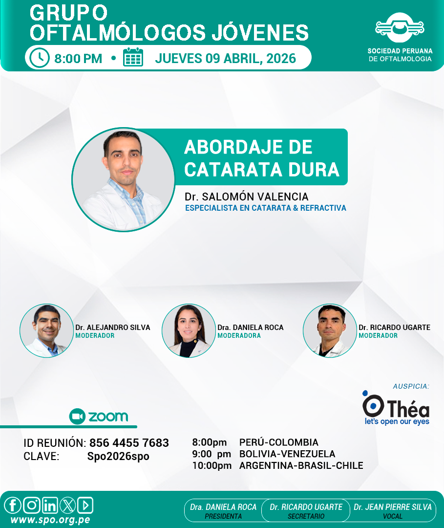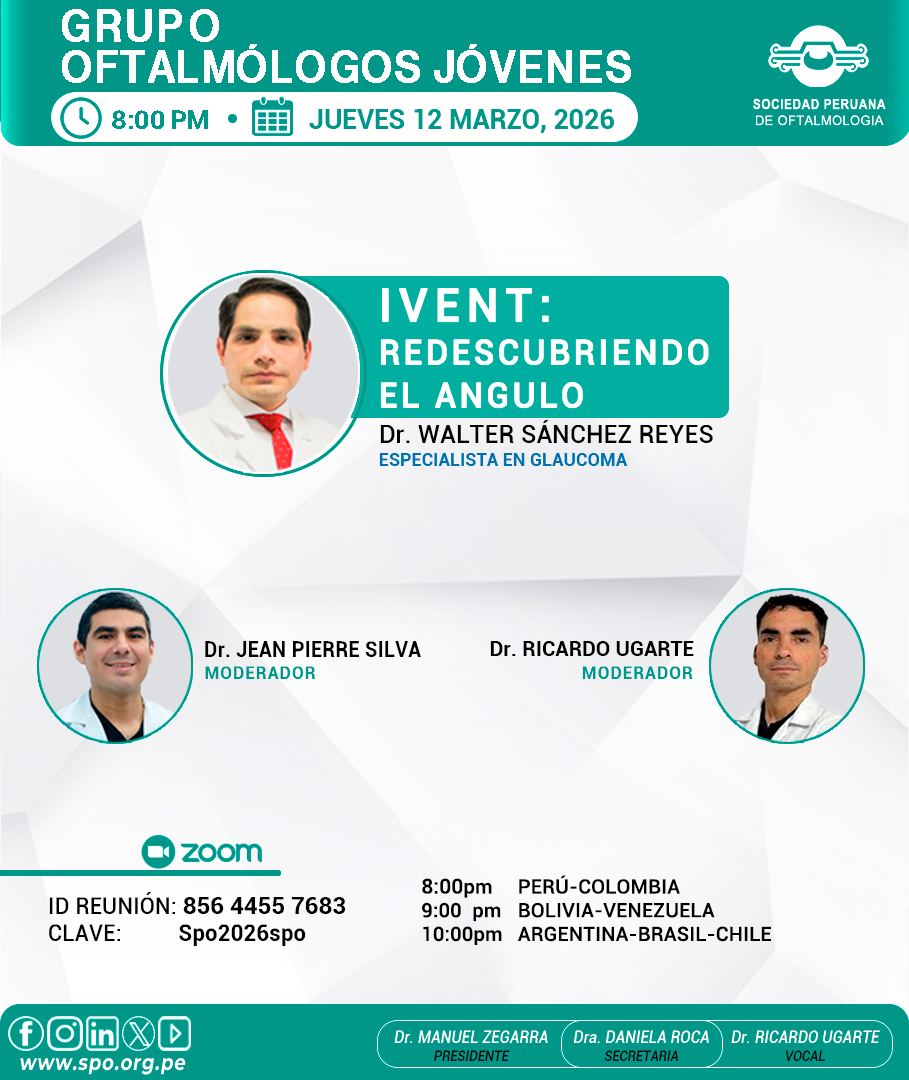 GRUPO DE OFTALMÓLOGOS JÓVENES SESIÓN VIRTUAL – ABRIL2026 JUEVES 09 ABRIL, 2026Dirigido a Médicos Oftalmólogos y Residentes de Oftalmología ID REUNIÓN: 856 4455 7683CLAVE: Spo2026spo INGRESAR VÍA ZOOM VER VIDEO VOLVER SESIÓN VIRTUAL – MARZO2026 JUEVES 12 MARZO, 2026Dirigido a Médicos Oftalmólogos y Residentes de Oftalmología ID REUNIÓN: 856 4455 7683CLAVE: Spo2026spo INGRESAR VÍA ZOOM VER VIDEO VOLVER SESIÓN VIRTUAL – JUNIO2025 JUEVES 12 JUNIO, 2025Dirigido a Médicos Oftalmólogos y Residentes de Oftalmología ID REUNIÓN: 856 4455 7683CLAVE: Spo2025spo INGRESAR VÍA ZOOM VER VIDEO VOLVER SESIÓN VIRTUAL – MAYO2025 JUEVES 08 MAYO, 2025Dirigido a Médicos Oftalmólogos y Residentes de Oftalmología ID REUNIÓN: 856 4455 7683CLAVE: Spo2025spo INGRESAR VÍA ZOOM VER VIDEO VOLVER SESIÓN VIRTUAL – MARZO2025 JUEVES 13 MARZO, 2025Dirigido a Médicos Oftalmólogos y Residentes de Oftalmología ID REUNIÓN: 856 4455 7683CLAVE: Spo2025spo INGRESAR VÍA ZOOM VER VIDEO VOLVER SESIÓN VIRTUAL – NOVIEMBRE2024 JUEVES 14 NOVIEMBRE, 2024Dirigido a Médicos Oftalmólogos y Residentes de Oftalmología ID REUNIÓN: 856 4455 7683CLAVE: Spo2024spo INGRESAR VÍA ZOOM VER VIDEO VOLVER SESIÓN VIRTUAL – OCTUBRE2024 JUEVES 10 OCTUBRE, 2024Dirigido a Médicos Oftalmólogos y Residentes de Oftalmología ID REUNIÓN: 856 4455 7683CLAVE: Spo2024spo INGRESAR VÍA ZOOM VER VIDEO VOLVER SESIÓN VIRTUAL – SETIEMBRE2024 JUEVES 12 SETIEMBRE, 2024Dirigido a Médicos Oftalmólogos y Residentes de Oftalmología ID REUNIÓN: 856 4455 7683CLAVE: Spo2024spo INGRESAR VÍA ZOOM VER VIDEO VOLVER SESIÓN VIRTUAL – AGOSTO2024 JUEVES 23 AGOSTO, 2024Dirigido a Médicos Oftalmólogos y Residentes de Oftalmología ID REUNIÓN: 856 4455 7683CLAVE: Spo2024spo INGRESAR VÍA ZOOM VER VIDEO VOLVER SESIÓN VIRTUAL – JULIO2024 JUEVES 11 JULIO, 2024Dirigido a Médicos Oftalmólogos y Residentes de Oftalmología ID REUNIÓN: 856 4455 7683CLAVE: Spo2024spo INGRESAR VÍA ZOOM VER VIDEO VOLVER SESIÓN VIRTUAL – JUNIO2024 JUEVES 13 JUNIO, 2024Dirigido a Médicos Oftalmólogos y Residentes de Oftalmología ID REUNIÓN: 856 4455 7683CLAVE: Spo2024spo INGRESAR VÍA ZOOM VER VIDEO VOLVER SESIÓN VIRTUAL – MAYO2024 JUEVES 09 MAYO, 2024Dirigido a Médicos Oftalmólogos y Residentes de Oftalmología ID REUNIÓN: 856 4455 7683CLAVE: Spo2024spo INGRESAR VÍA ZOOM VER VIDEO VOLVER SESIÓN VIRTUAL – NOVIEMBRE2023 JUEVES 09 NOVIEMBRE, 2023Dirigido a Médicos Oftalmólogos y Residentes de Oftalmología ID REUNIÓN: 856 4455 7683CLAVE: Spo2023spo INGRESAR VÍA ZOOM VER VIDEO VOLVER SESIÓN VIRTUAL – SETIEMBRE2023 LUNES 25 SETIEMBRE, 2023Dirigido a Médicos Oftalmólogos y Residentes de Oftalmología ID REUNIÓN: 856 4455 7683CLAVE: Spo2023spo INGRESAR VÍA ZOOM VER VIDEO VOLVER SESIÓN VIRTUAL – JULIO2023 JUEVES 13 JULIO, 2023Dirigido a Médicos Oftalmólogos y Residentes de Oftalmología ID REUNIÓN: 856 4455 7683CLAVE: Spo2023spo INGRESAR VÍA ZOOM VER VIDEO VOLVER SESIÓN VIRTUAL – MAYO2023 JUEVES 11 MAYO, 2023Dirigido a Médicos Oftalmólogos y Residentes de Oftalmología ID REUNIÓN: 856 4455 7683CLAVE: Spo2023spo INGRESAR VÍA ZOOM VER VIDEO VOLVER